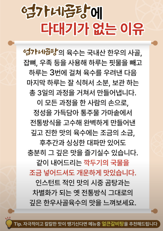 | 갈비곰탕 | 14,000원 | 갈비 가득 진한 국물 |