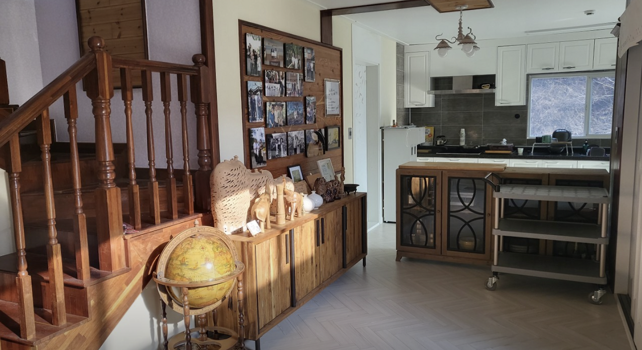 숙소 내부는 LP 음악이 흐르는 감성 공간으로 꾸며져 있어요. LP판이 돌아가는 소리, 고요한 산 속의 자연소리, 그리고 나무 가구로 꾸며진 내부 공간이 조화를 이루며 마치 시골 할머니 댁에 온 듯한 따뜻함을 선사하죠. 마음이 편안해지는 분위기예요.