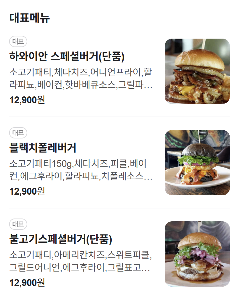 A2. 오리지널 스페셜, 하와이안 스페셜, 블랙 치폴레 버거가 가장 많이 판매되는 대표 메뉴예요.
