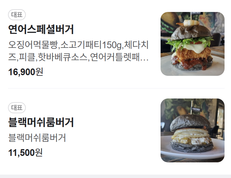 | 오징어먹물 번 | 블랙 컬러 비주얼, 고소함 | 블랙쉬림프, 블랙치폴레 |