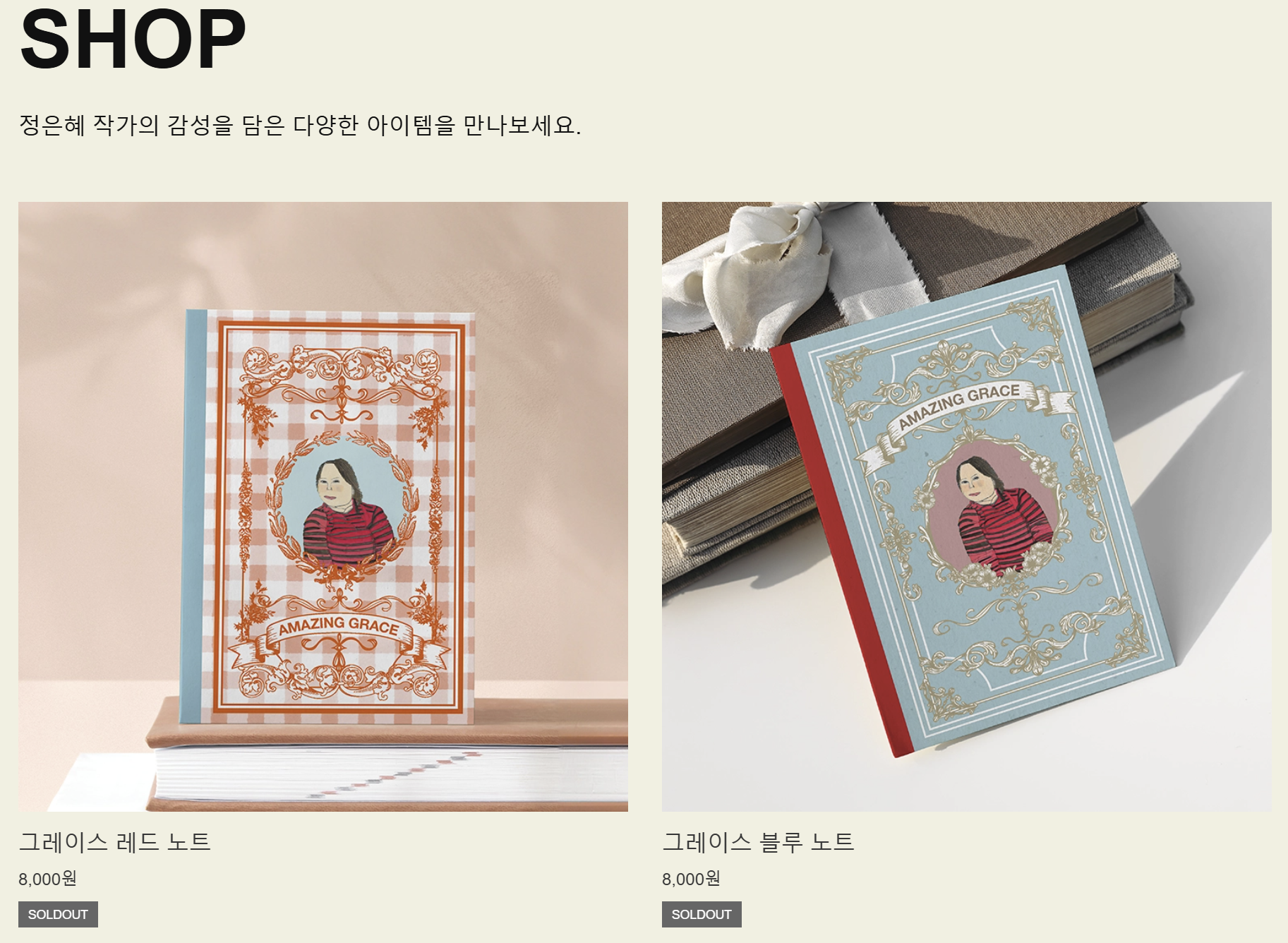이곳에서는 캐리커쳐뿐 아니라 자화상, 인물화, 공동 창작 작품 등 다양한 작업을 감상할 수 있고, 일부는 굿즈 형태로도 만나볼 수 있어요. 레드노트와 블루노트가 너무 멋진데 현재는 솔드아웃이군요!