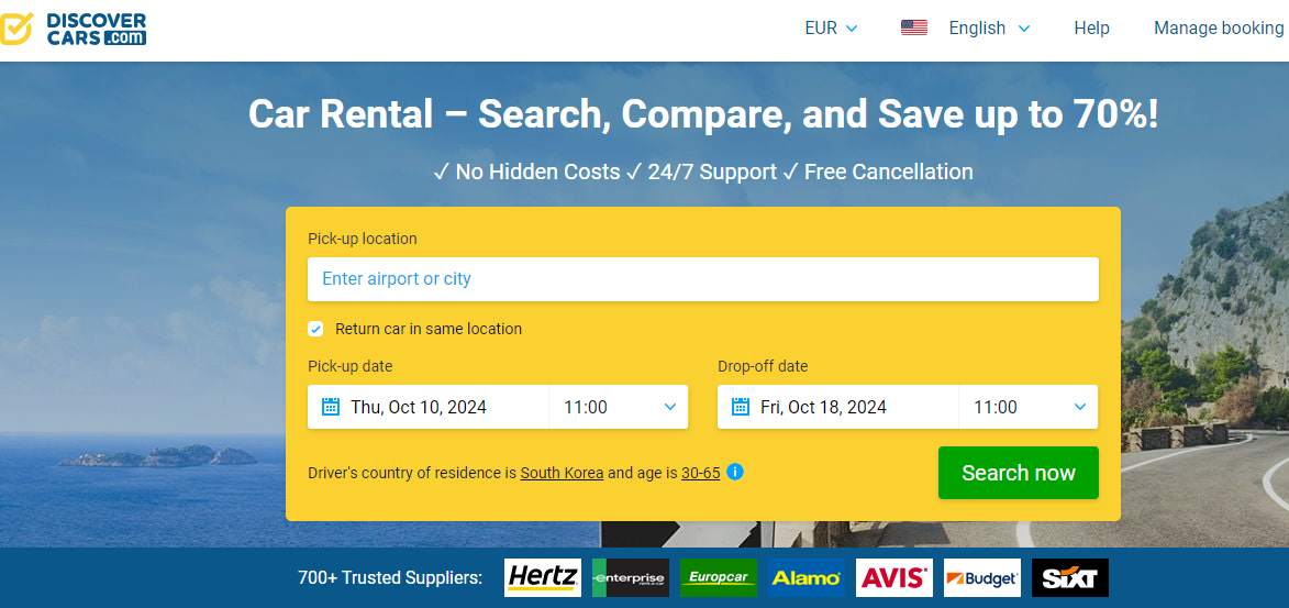 Discover Cars는 해외 여행객에게 유용한 렌트카 예약 플랫폼으로, 간편한 절차와 저렴한 가격을 제공합니다. 전 세계 어디에서나 쉽게 렌트카를 예약할 수 있어 해외 여행 시 유용합니다.