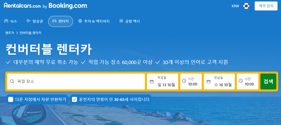 Rentalcars.com은 전 세계 60,000개 이상의 위치에서 렌트카를 제공하는 글로벌 플랫폼으로, 한국에서도 이용할 수 있습니다. 다양한 업체를 비교하여 최적의 가격으로 예약할 수 있는 장점이 있습니다.