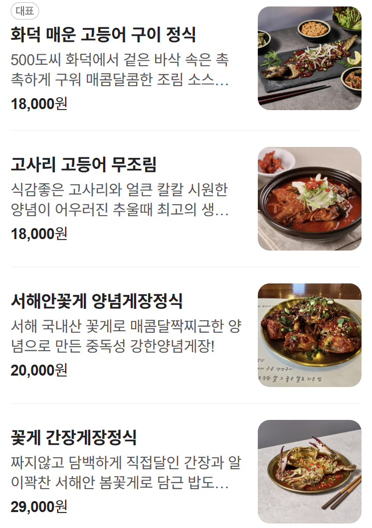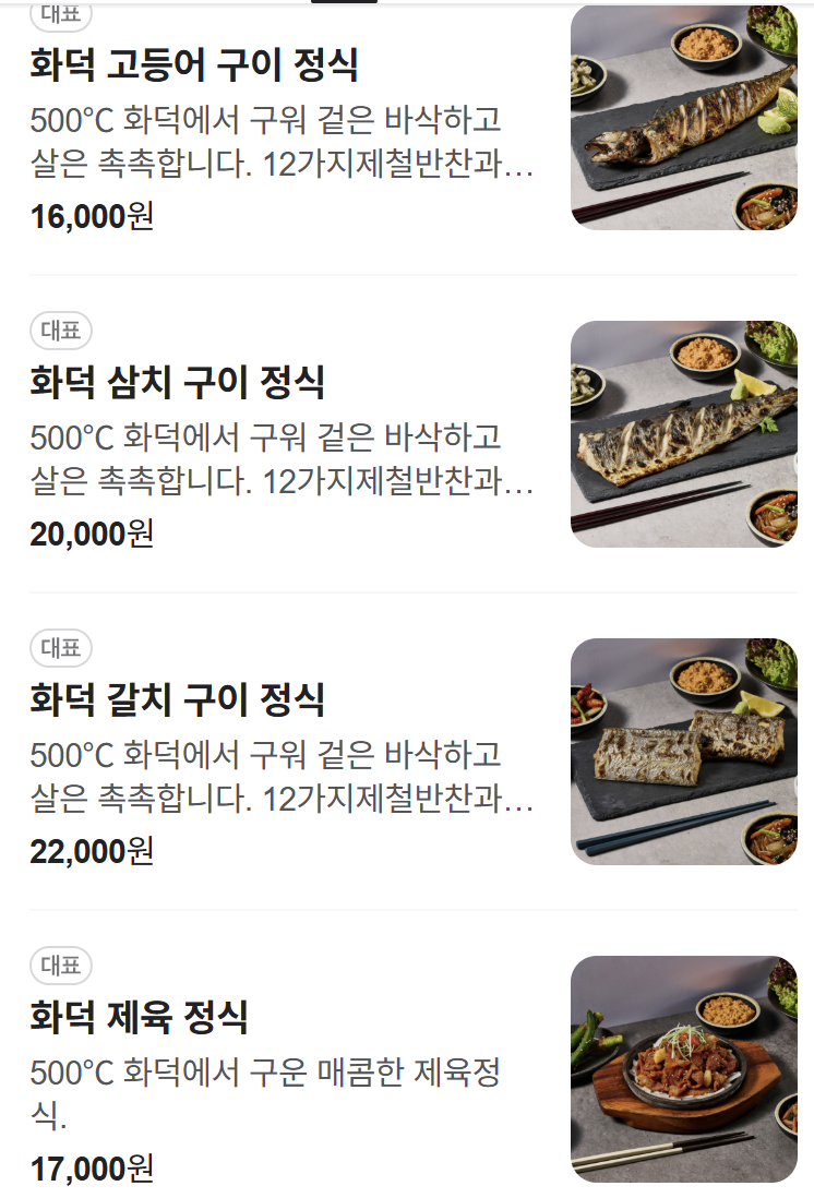 - 화덕 고등어 구이 정식 – 16,000원 (시그니처 메뉴)