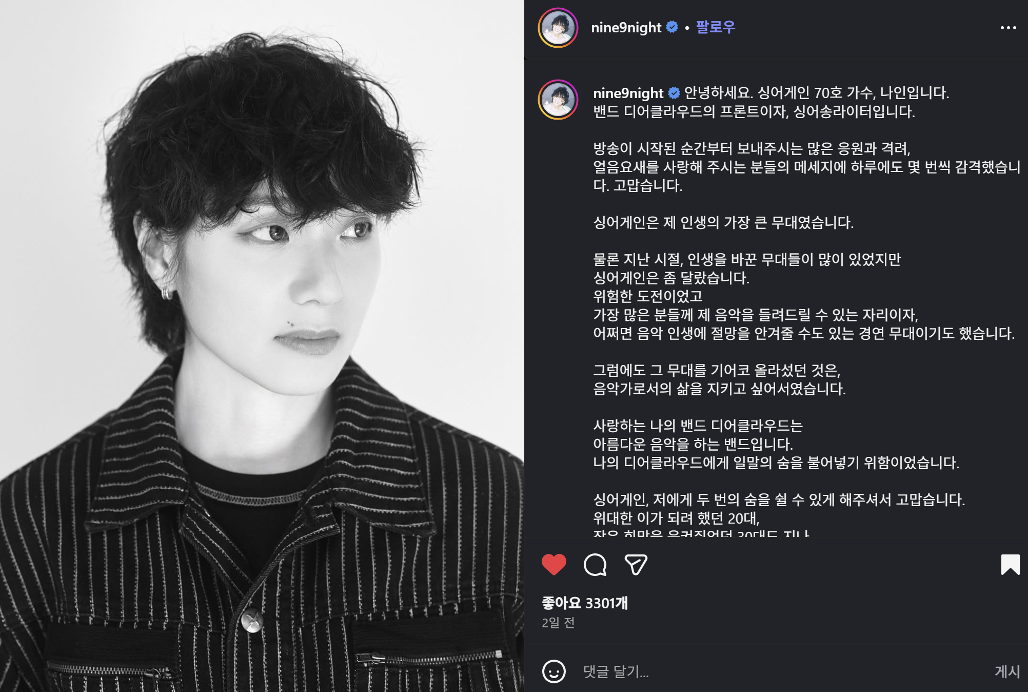 그녀에게 <싱어게인>은 단순한 경연이 아니라, “인생 2막을 여는 거대하고 근사한 문”이었다는 말처럼 이제 나인의 새로운 음악 여정이 시작된 것이겠죠.