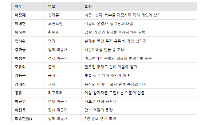임시완, 강하늘, 박성훈, 조유리, 양동근, 강애심 등이 새롭게 합류하며, 이정재, 이병헌, 공유 등 기존 배우들도 다시 등장합니다.