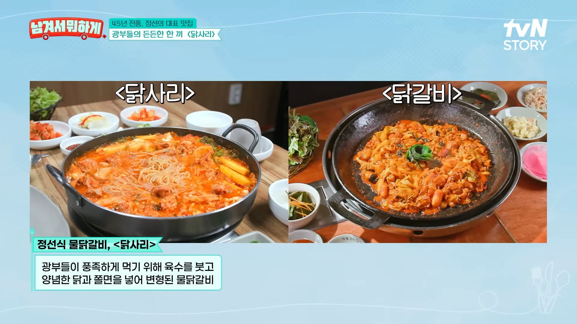 정선편에서는 단순한 맛집 소개를 넘어, 사람 사이의 따뜻한 감정을 함께 나눌 수 있는 식탁이 준비됐어요. 방송에 나온 진식당은 1986년부터 운영된 정통 맛집으로, 광부들의 보양식이었던 ‘물닭갈비’를 지금까지 그대로 이어오고 있어요.
