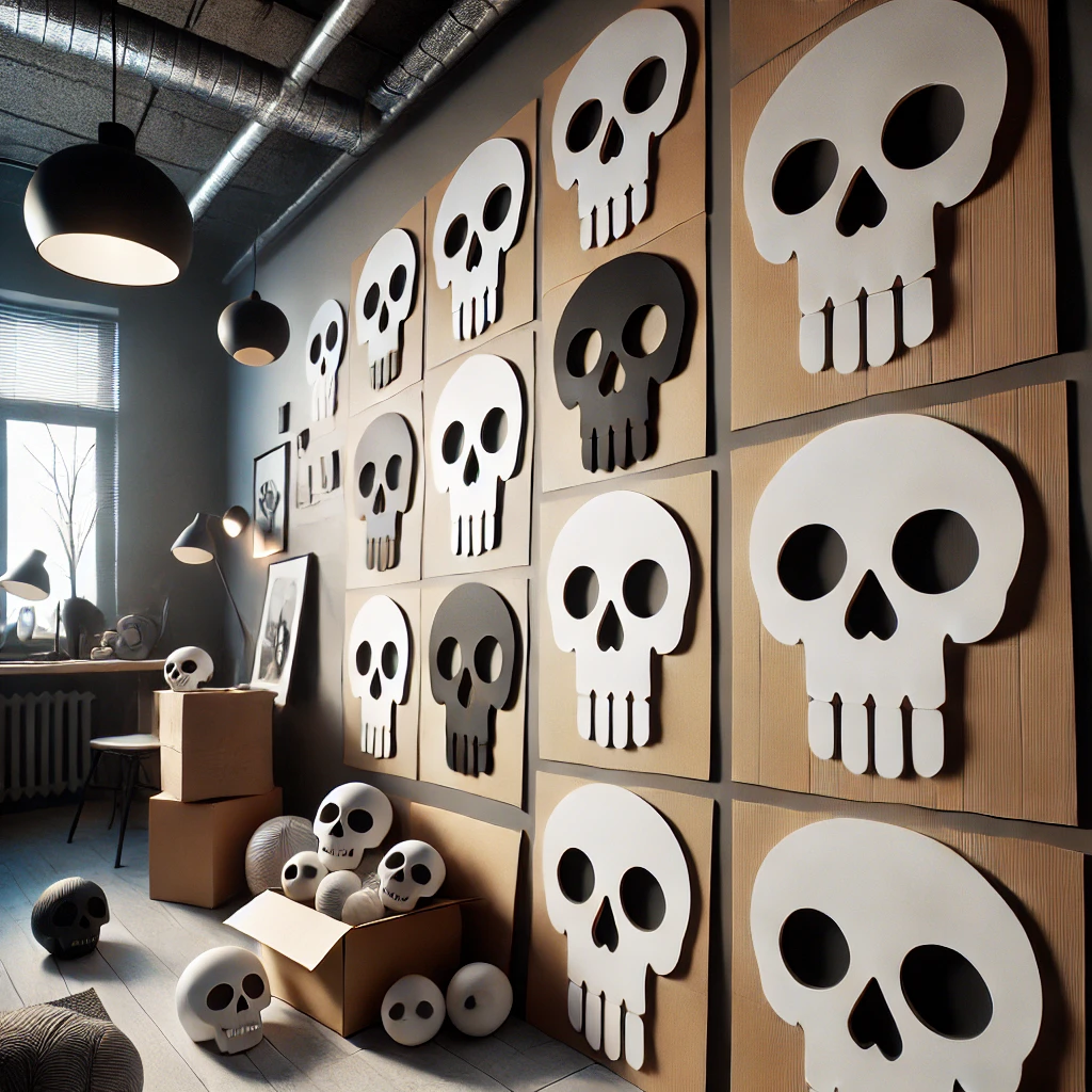 집에서 쉽게 구할 수 있는 종이 박스를 재활용해 해골 모양을 만들 수 있습니다. 해골 모양을 여러 개 만들어 벽에 장식하면 매우 공포스러운 분위기를 줄 수 있습니다. 흰색이나 검은색으로 해골을 칠한 후, 이를 집 안 여러 곳에 배치하면 낮에도 밤에도 눈에 띄는 할로윈 장식이 될 것입니다. 제작 과정도 간단하고 비용이 들지 않아 누구나 쉽게 시도할 수 있는 장식 아이디어입니다.
