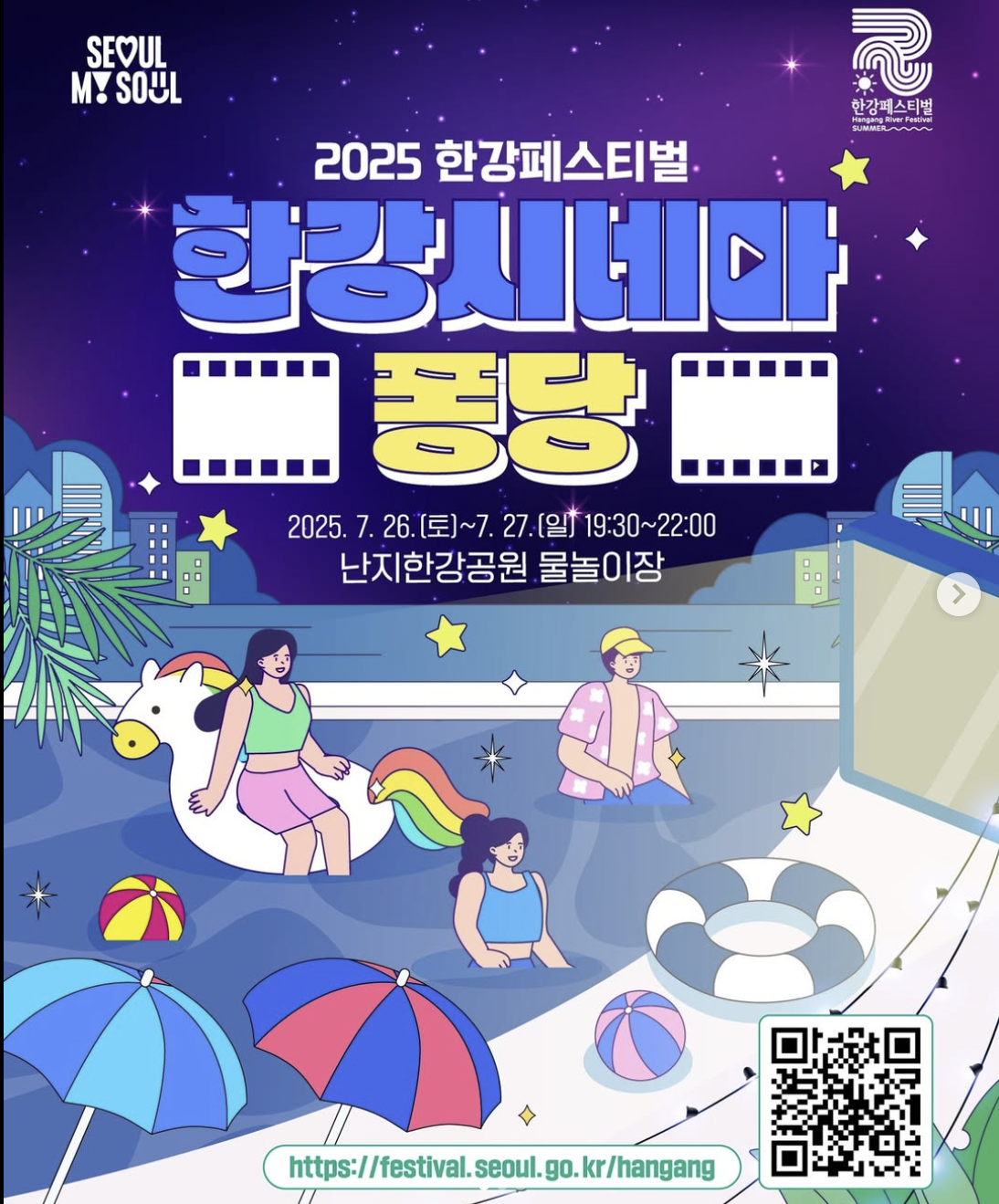 | 7.26(토)~7.27(일) 19:30~22:00 | 난지한강공원 물놀이장 | 현장참여 | 1,000원~3,000원 |