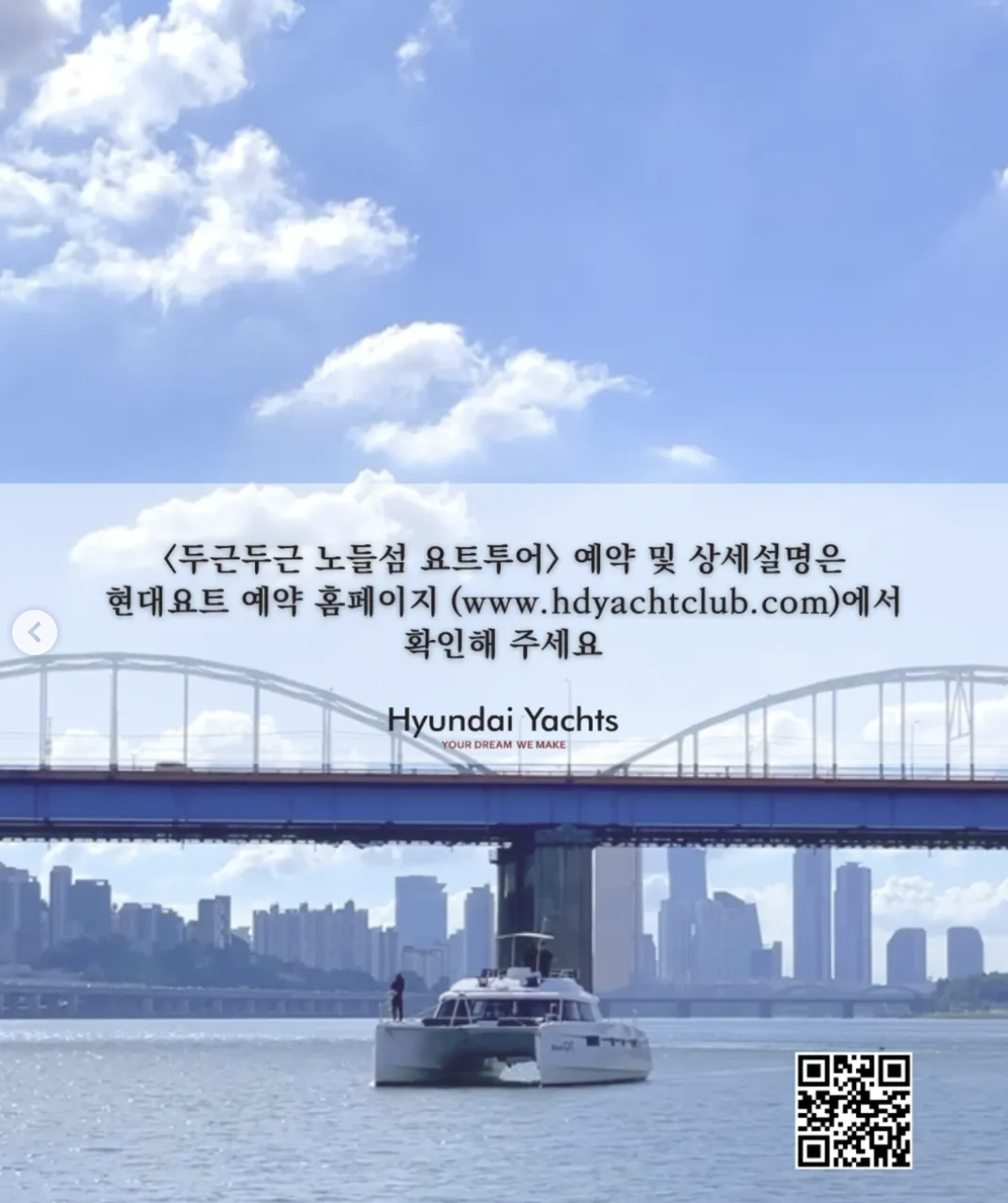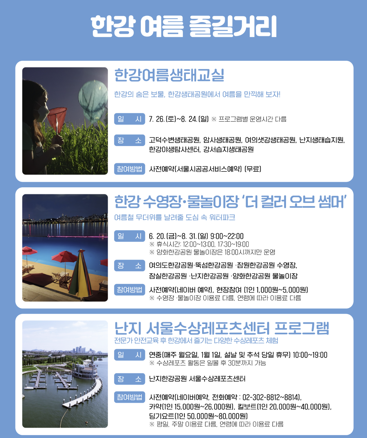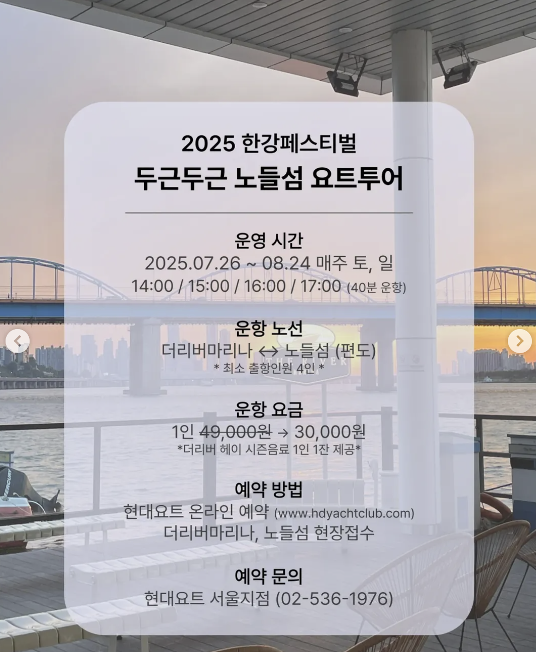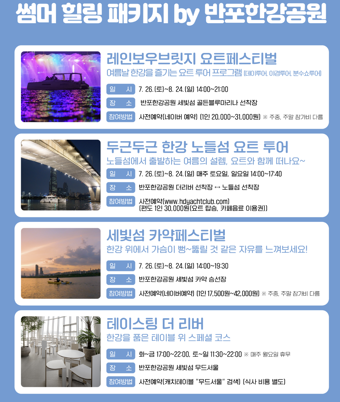 | 노들섬 요트투어 | 7.26~8.24 (토·일) | 14:00~17:40 | 반포 ↔ 노들섬 | www.hyduatclub.com |