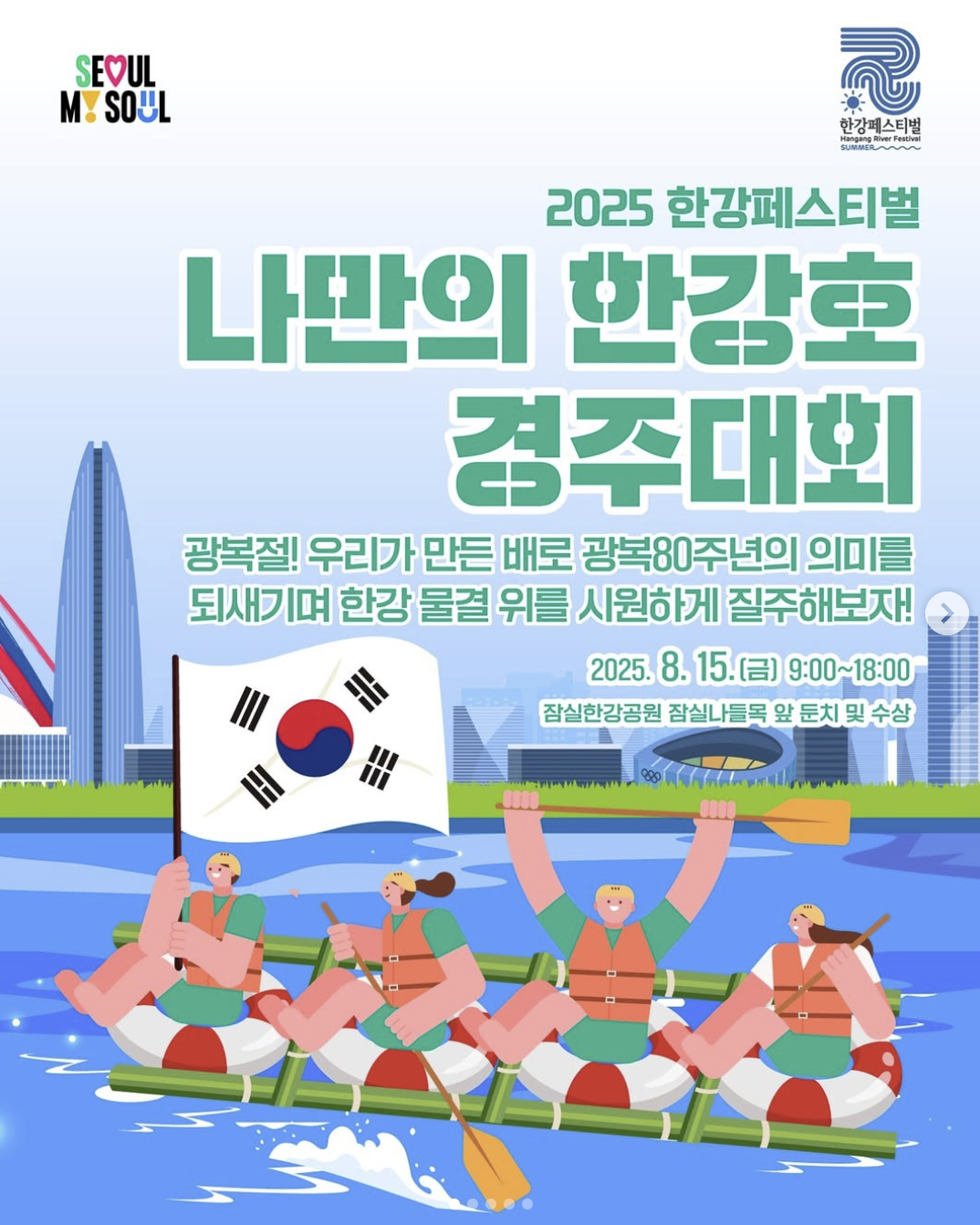 올해는 광복 80주년을 기념하는 다양한 프로그램도 함께 열려요. 직접 만든 배로 달리는 ‘나만의 한강호 경주대회’부터 음악과 함께 물속으로 풍덩 빠지는 ‘한강시네마퐁당’, DJ와 함께 헤드폰을 쓰고 즐기는 무소음파티까지! 낮부터 밤까지 지루할 틈 없는 축제의 현장, 지금부터 같이 살펴볼까요? ☀️