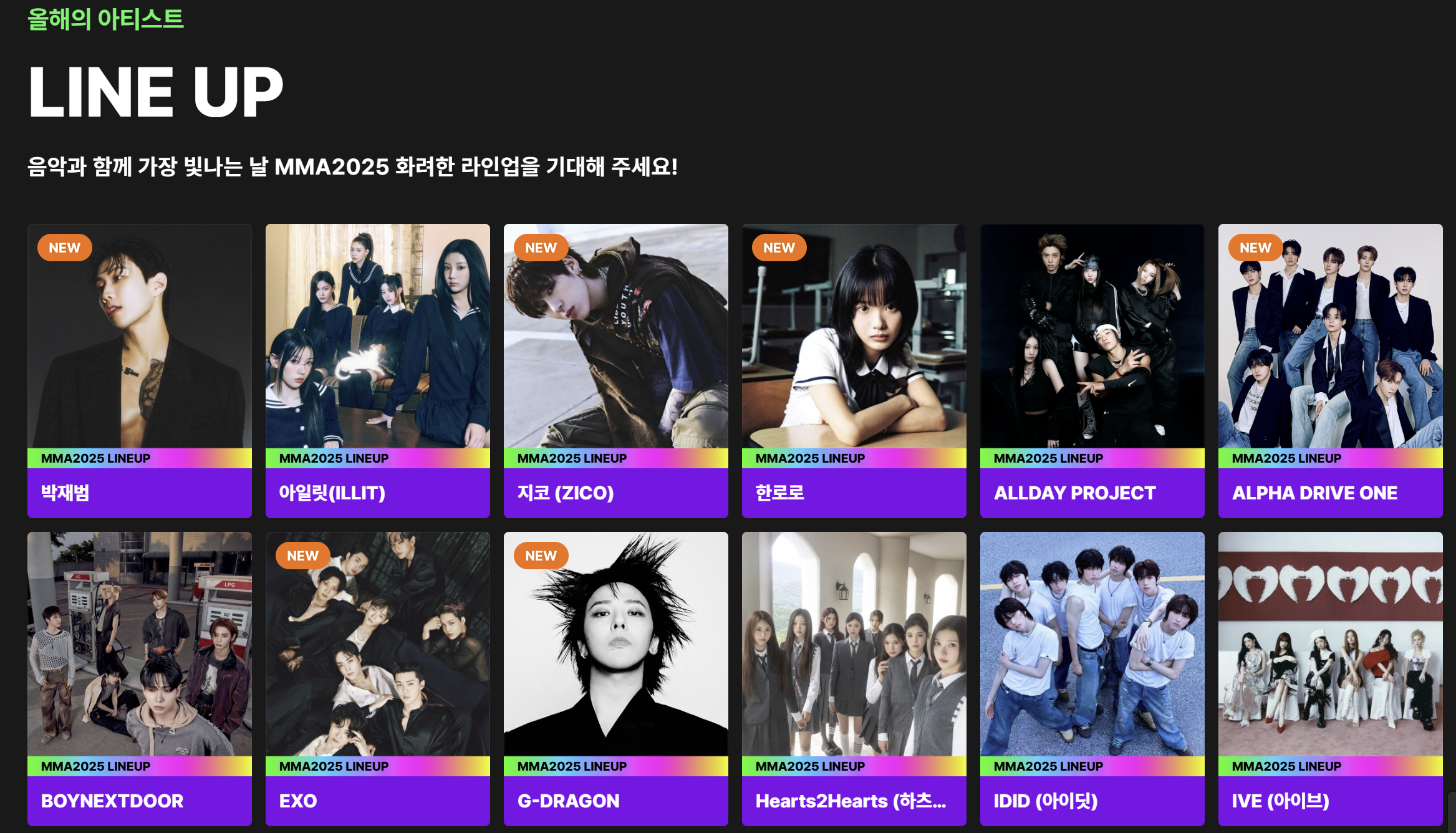 | 보이그룹 | RIIZE, BOYNEXTDOOR, NCT WISH, PLAVE, ALPHA DRIVE ONE | 신인부터 베테랑까지 고루 구성 |