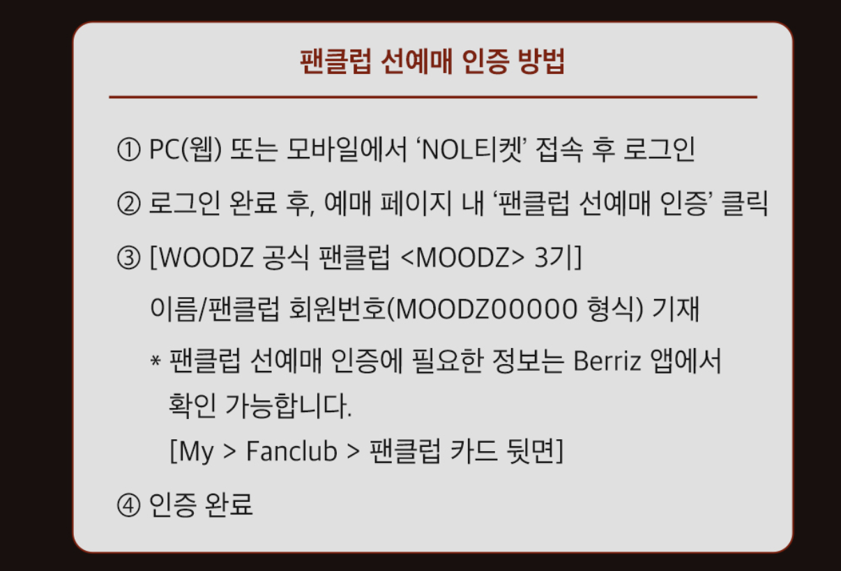 팬클럽 정보와 티켓 예매 아이디 정보가 일치해야 인증이 가능하니까, 꼭 확인하고 진행해 주셔야 해!