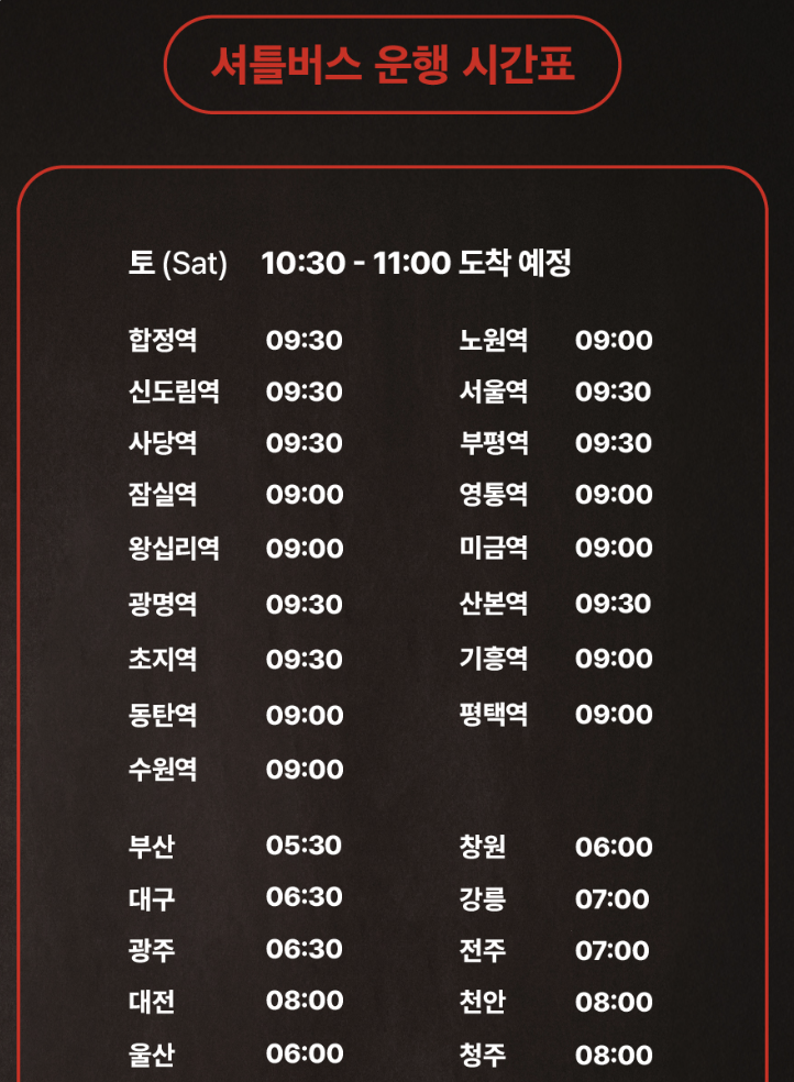 저는 일단, 티켓팅 전이지만 귀가행 먼저 예약완료했고 공연장행은 아침 일찍 시간만 있어서 스케쥴 확인 후